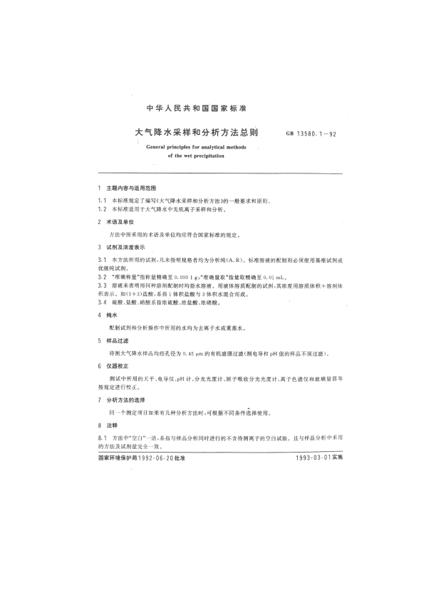 1.1本标准规定了编写《大气降水采样和分析方法》的一般要求和原则. 1.2本标准适用于大气降水中无机离子采样和分析。