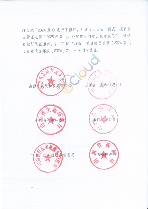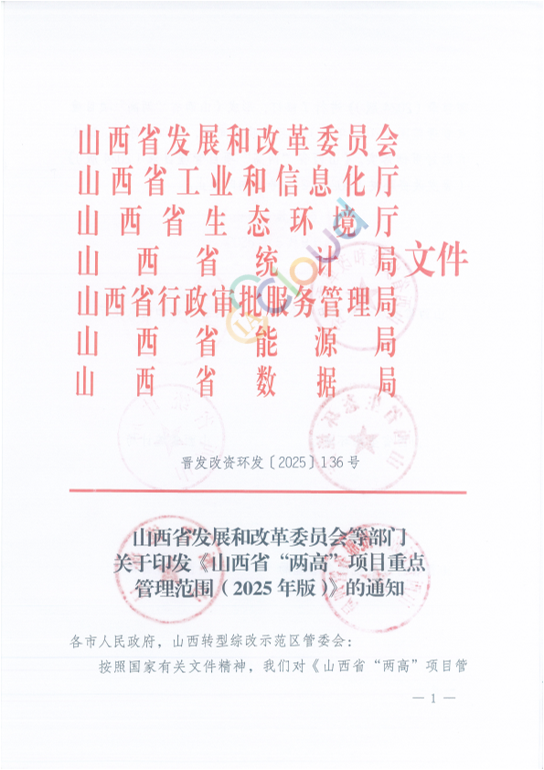 各市人民政府,山西转型综改示范区管委会: 按照国家有关文件精神,我们对《山西省“两高”项目管理目录(2024版)》进行了修订,形成《山西省“两高”项目重点管理范围(2025年版)》。经省政府同意,现印发你们,请认真做好贯彻落实。《山西省“两高”项目管理目录(2024版)》(晋发改资环发〔2024〕219号)同时废止。 山西省发展和改革委员会 山西省工业和信息化厅 山西省生态环境厅 山西省统计局 山西省行政审批服务管理局 山西省能源局 山西省数据局 2025年5月9日
