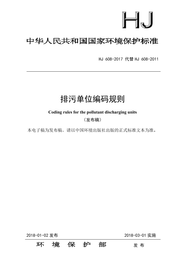为贯彻《中华人民共和国环境保护法》《中华人民共和国水污染防治法》《中华人民共和国大气污染防治法》,防治环境污染,改善环境质量,实现对排污单位标识和表示的规范化,制定本标准。 本标准规定了排污单位及其所属的固定场所、生产设施、污染治理设施、排放口等的编码规则。 本标准附录A、附录B为资料性附录。 本标准首次发布于2011年,本次为第一次修订。 本标准对《污染源编码规则(试行)》(HJ 608-2011)主要做了如下修改: ——调整标准名称为排污单位编码规则; ——调整排污单位A类编码规则; ——扩展排污单位B类编码规则; ——增加排污单位及其所属的固定场所、生产设施、污染治理设施、排放口等的编码规则; ——删除原附录A 污染源代码示例,调整为附录A固定污染源代码示例; ——增加附录B生产设施、污染治理设施、排放口代码示例。 本标准由环境保护部办公厅、科技标准司组织修订。 本标准主要起草单位:环境保护部信息中心、环境保护部环境工程评估中心。 本标准环境保护部2018年1月2日批准。 本标准自2018年3月1日起实施。 本标准由环境保护部解释。