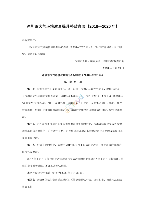 各有关单位: 《深圳市大气环境质量提升补贴办法(2018—2020年)》已经市政府同意。现予印发,请认真组织实施。 深圳市人居环境委员会 深圳市财政委员会 2018年9月13日