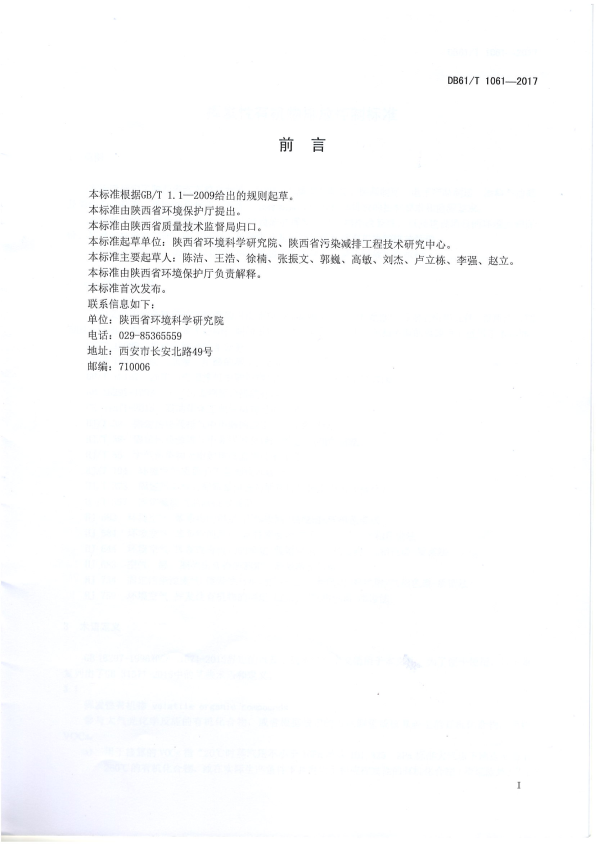 本标准根据GB/T 1. 1-2009给出的规则起草。 本标准由陕西省环境保护厅提出。 本标准山陕西省质量技术监督局归口。 本标准起草单位:陕西省环境科学研究院、陕西省污染减排工程技术研究中心。 本标准主要起草人:陈洁、王浩、徐楠、张振文、郭巍、高敏、刘杰、卢立栋、李强、赵立。 本标准由陕西省环境保护厅负责解释。 本标准首次发布。 联系信息如下: 单位:陕西省环境科学研究院 电话:029-85365559 地址:西安市长安北路49号 邮编:710006