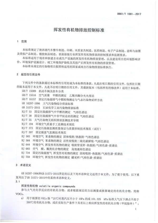 本标准规定了陕西省汽车整车制造、印刷、木质家具制造、医药制造、电子产品制造、涂料与油墨及类似产品制造、橡胶制品制造、表面涂装行业挥发性有机物排放的控制要求和监测要求。 本标准适用于现有和新建企业或生产设施的挥发性有机物排放管理,以及建设项目的环境影响评价、环境保护设施设计、竣工环境保护验收及其投产后挥发性有机物的排放管理。 本标准未规定的污染物项目按照相适用的国家或地方污染物排放标准执行。