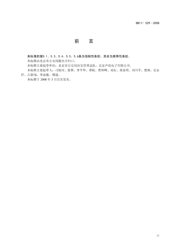 本标准的第5.1、5.3、5.4、5.5、5.6条为强制性条款,其余为推荐性条款。 本标准由北京市公安局提出并归口。 本标准主要起草单位:北京市公安局治安管理总队,北京声迅电子有限公司。 本标准主要起草人:刁俊河、聂蓉、李平举、谭权、曹帅峰、刘东、龚嘉明、刘川平、楚林、安永钎、古新闯、李凌薇、傅进。 本标准于 2008 年 3 月首次发布。