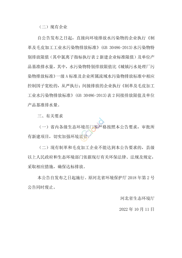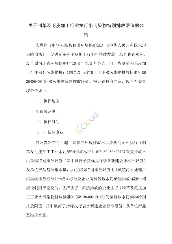 为贯彻《中华人民共和国环境保护法》《中华人民共和国水污染防治法》,促进制革和毛皮加工行业可持续发展,结合我省实际,废止原河北省环境保护厅2018年第2号公告。河北省制革和毛皮加工行业部分污染物执行《制革及毛皮加工工业水污染物排放标准》(GB 30486-2013)水污染物特别排放限值。报经省政府同意,现将有关事项公告如下: