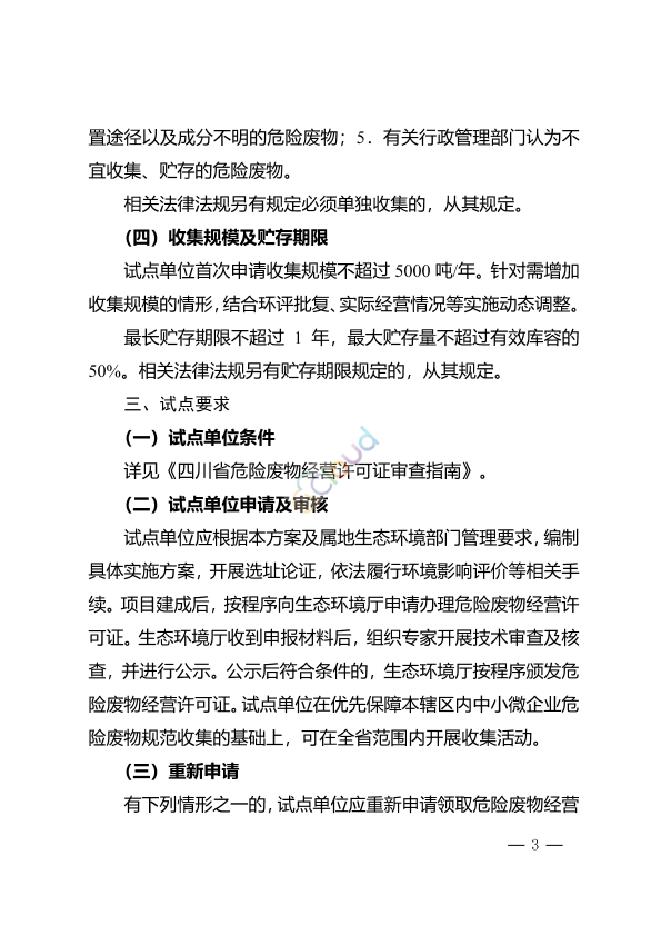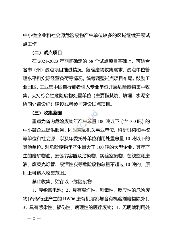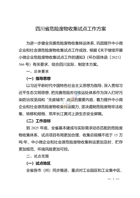 各市(州)生态环境局,各有关单位: 《四川省危险废物收集试点工作方案》经生态环境厅第18次厅务会审议通过,现印发你们,请认真组织实施。 附件:四川省危险废物收集试点工作方案 四川省生态环境厅 2024年3月4日