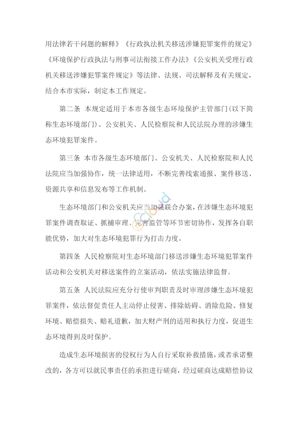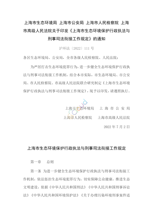 各区生态环境局、公安局,全市各级人民检察院、人民法院: 为严厉打击生态环境犯罪行为,进一步健全生态环境保护行政执法与刑事司法衔接工作机制,结合本市实际,市生态环境局、市公安局、市人民检察院、市高级人民法院联合研究制定《上海市生态环境保护行政执法与刑事司法衔接工作规定》,现予以印发,请遵照执行。 上海市生态环境局 上 海 市 公 安 局 上海市人民检察院 上海市高级人民法院 2022年7月2日