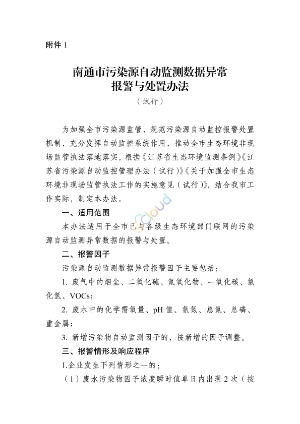 各驻县(市、区)生态环境局,各处室、单位: 为进一步加强污染源监管,依据《江苏省生态环境监测条例》《江苏省污染源自动监控管理办法(试行)》《关于加强全市生态环境非现场监管执法工作的实施意见(试行)》,制定《南通市污染源自动监测数据异常报警与处置办法(试行)》,现印发给你们,请认真贯彻落实。 各驻县(市、区)局和相关处室(单位)明确报警信息接收人,于4月22日17时前将人员名单报送市生态环境监控中心。联系人:张翔,联系电话:15951314966,邮箱:70964060@qq.com。 附件: 南通市生态环境局 2022年4月19日
