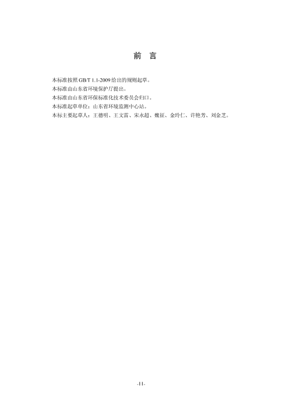 本标准按照 GB/T 1.1-2009 给出的规则起草。 本标准由山东省环境保护厅提出。 本标准由山东省环保标准化技术委员会归口。 本标准起草单位:山东省环境监测中心站。 本标主要起草人:王德明、王文雷、宋永超、魏征、金玲仁、许艳芳、刘金芝。
