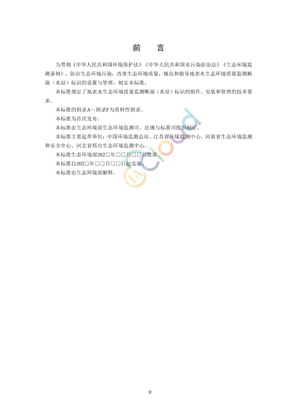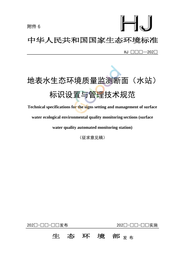 为贯彻《中华人民共和国环境保护法》《中华人民共和国水污染防治法》《生态环境监测条例》,防治生态环境污染,改善生态环境质量,规范和指导地表水生态环境质量监测断面(水站)标识的设置与管理,制定本标准。