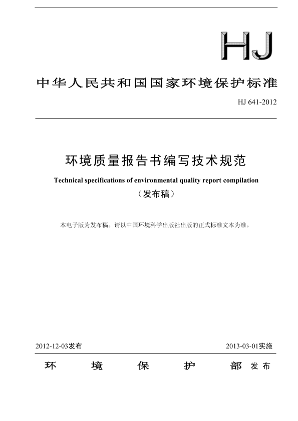 为贯彻《中华人民共和国环境保护法》,规范环境质量报告书的编制工作,制定本标准。 本标准规定了环境质量报告书的总体要求、分类与结构、组织与编制程序、编写提纲等内容。 本标准由环境保护部科技标准司组织制订。 本标准主要起草单位:中国环境监测总站、黑龙江省环境监测中心站。 本标准由环境保护部2012年12月3日批准。 本标准自2013年3月1日起实施。 本标准由环境保护部解释。
