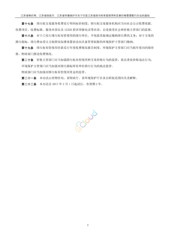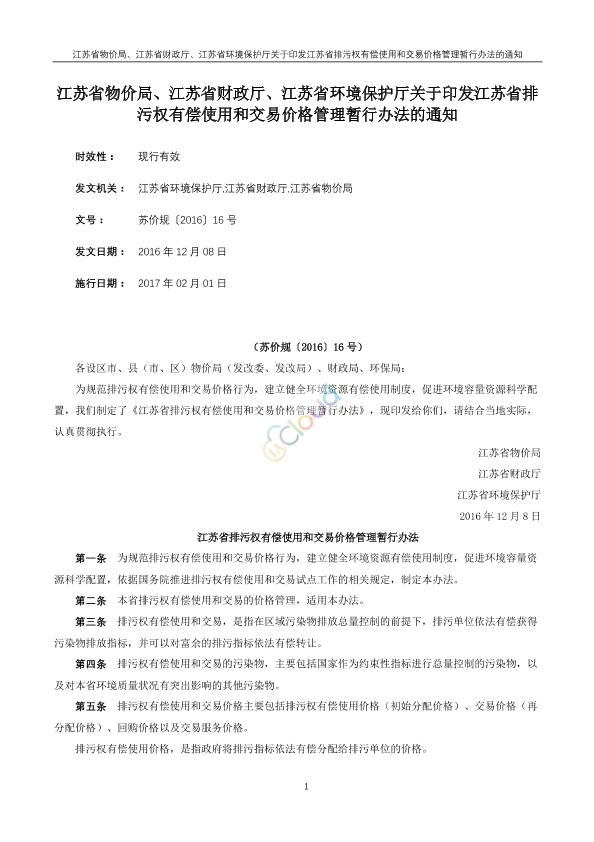 各设区市、县(市、区)物价局(发改委、发改局)、财政局、环保局: 为规范排污权有偿使用和交易价格行为,建立健全环境资源有偿使用制度,促进环境容量资源科学配置,我们制定了《江苏省排污权有偿使用和交易价格管理暂行办法》,现印发给你们,请结合当地实际,认真贯彻执行。 江苏省物价局 江苏省财政厅 江苏省环境保护厅 2016年12月8日