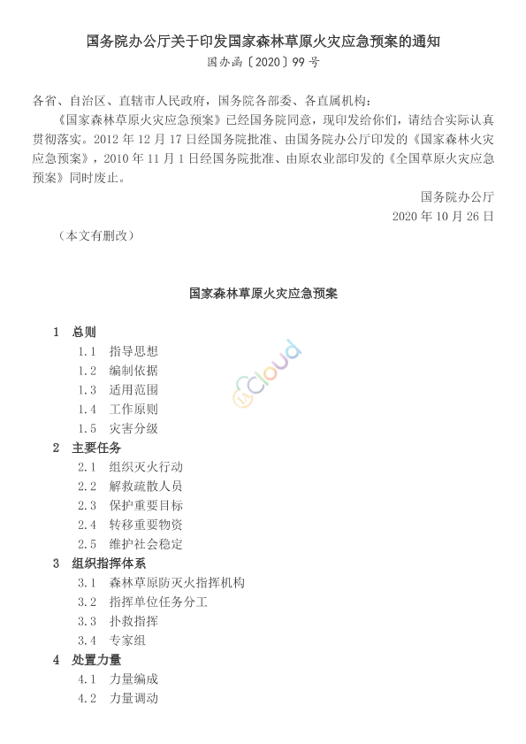 各省、自治区、直辖市人民政府,国务院各部委、各直属机构: 《国家森林草原火灾应急预案》已经国务院同意,现印发给你们,请结合实际认真贯彻落实。2012年12月17日经国务院批准、由国务院办公厅印发的《国家森林火灾应急预案》,2010年11月1日经国务院批准、由原农业部印发的《全国草原火灾应急预案》同时废止。 国务院办公厅 2020年10月26日