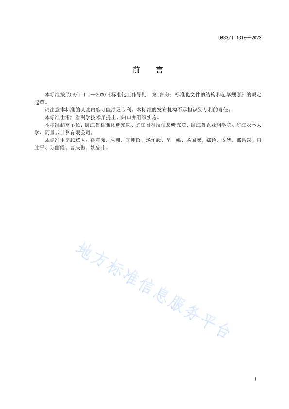 本标准按照GB/T 1. 1- 2020《标准化工作导则第1部分: 标准化文件的结构和起草规则》的规定起草。 请注意本标准的某些内容可能涉及专利。本标准的发布机构不承担识别专利的责任。 本标准由浙江省科学技术厅提出、归口并组织实施。 本标准起草单位:浙江省标准化研究院、浙江省科技信息研究院、浙江省农业科学院、浙江农林大学、阿里云计算有限公司。 本标准主要起草人:孙雅和、朱明、李明珍、汤江武、吴一鸣、杨国彦、郑玲、安然、邵昌深、田胜平、孙丽霞、曹庆傲、姚宏伟。