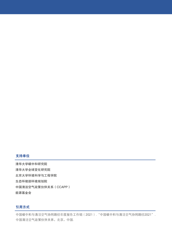随着《大气污染防治行动计划》和《打赢蓝天保卫战三年行动计划》的先后实施,近年来我国PM2.5 浓度持续下降,空气质量明显改善。然而,当前PM2.5 污染程度仍处于高位,空气质量改善任务依然艰巨;同时随着污染治理进程的深入,污染物减排空间逐渐收窄,末端治理的减排难度日益增大。 2020 年9 月,习近平总书记在第七十五届联合国大会一般性辩论上宣布中国将力争2030 年前二氧化碳排放达到峰值,努力争取2060 年前实现碳中和。这一重大战略目标的提出不仅为社会经济高水平发展指明了方向,也为统筹大气污染防治与温室气体减排提供了基本遵循,为空气质量持续改善注入了全新动能。在此基础上,生态环境部提出将以“减污降碳协同增效”为总抓手,加快推动从末端治理向源头治理转变,通过应对气候变化降低碳排放,进而从根本上解决环境污染问题,推动高质量发展。 在这一战略背景下, 由清华大学、生态环境部环境规划院和北京大学联合发起,在能源基金会和中国清洁空气政策伙伴关系(CCAPP)支持下,组织国内40 多位一线学者,通过构建我国空气污染与气候变化协同治理监测指标体系,编制《中国碳中和与清洁空气协同路径年度报告(2021)》,跟踪、梳理、总结与分析我国空气污染与气候变化协同治理进程,助力形成政策制定、评价与优化的闭环,推动协同治理政策的落地实施。 本报告以空气污染与气候变化协同治理监测指标为基础,以自然科学和社会科学深度交叉融合为导向,从空气污染与天气气候条件、结构转型进展、大气成分源汇与减排路径、健康影响与协同效应、协同治理体系与实践等五个方面出发设定18 项指标,通过定期追踪各项指标的进展状况,逐步建立碳中和与清洁空气协同治理理论体系,识别中国在碳中和与清洁空气协同路径上面临的挑战并提出解决思路。