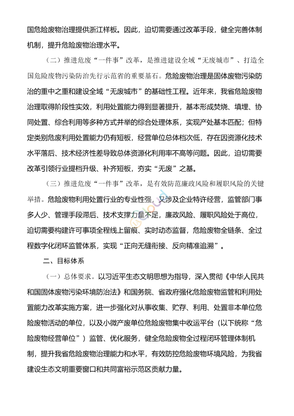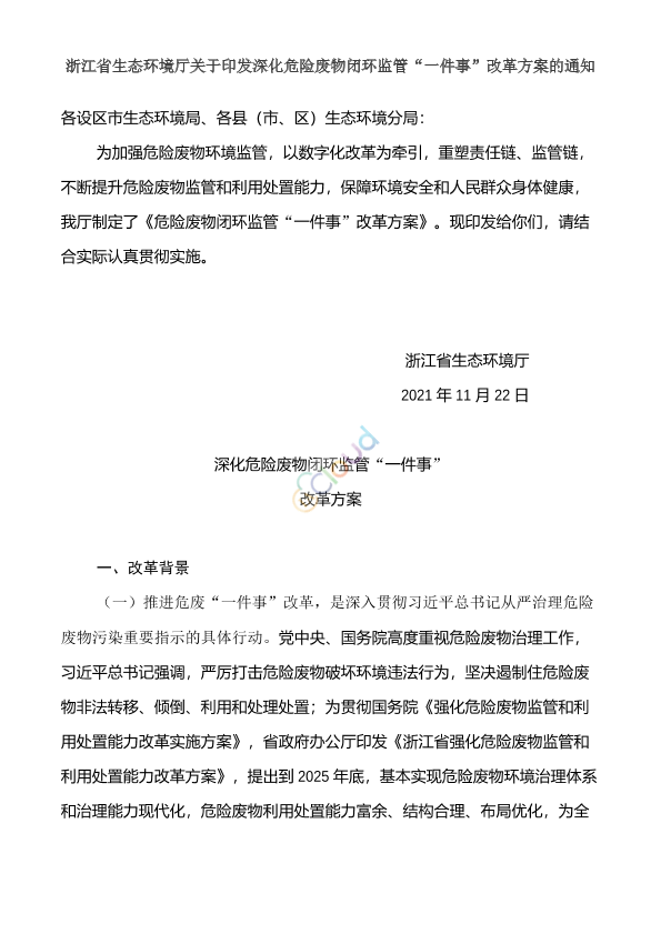 各设区市生态环境局、各县(市、区)生态环境分局: 为加强危险废物环境监管,以数字化改革为牵引,重塑责任链、监管链,不断提升危险废物监管和利用处置能力,保障环境安全和人民群众身体健康,我厅制定了《危险废物闭环监管“一件事”改革方案》。现印发给你们,请结合实际认真贯彻实施。 浙江省生态环境厅 2021年11月22日