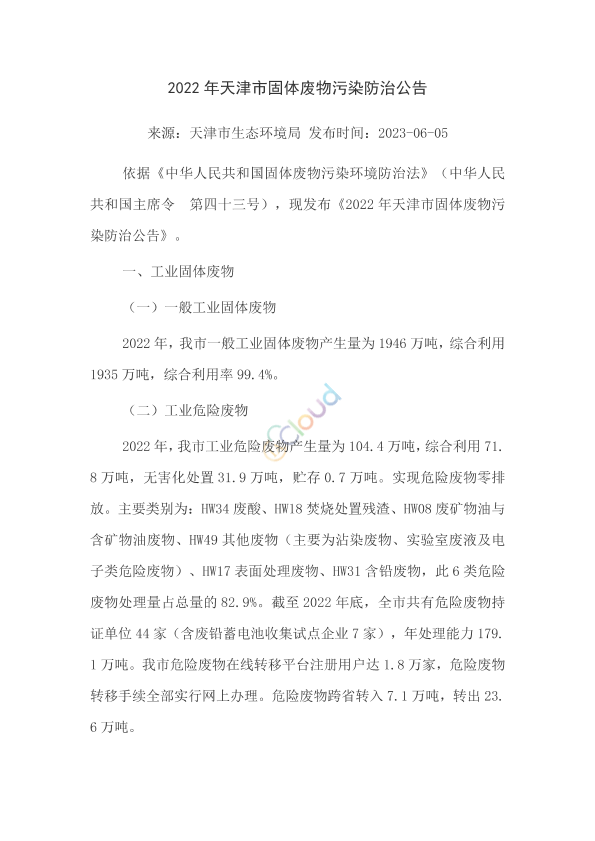 依据《中华人民共和国固体废物污染环境防治法》(中华人民共和国主席令 第四十三号),现发布《2022年天津市固体废物污染防治公告》。