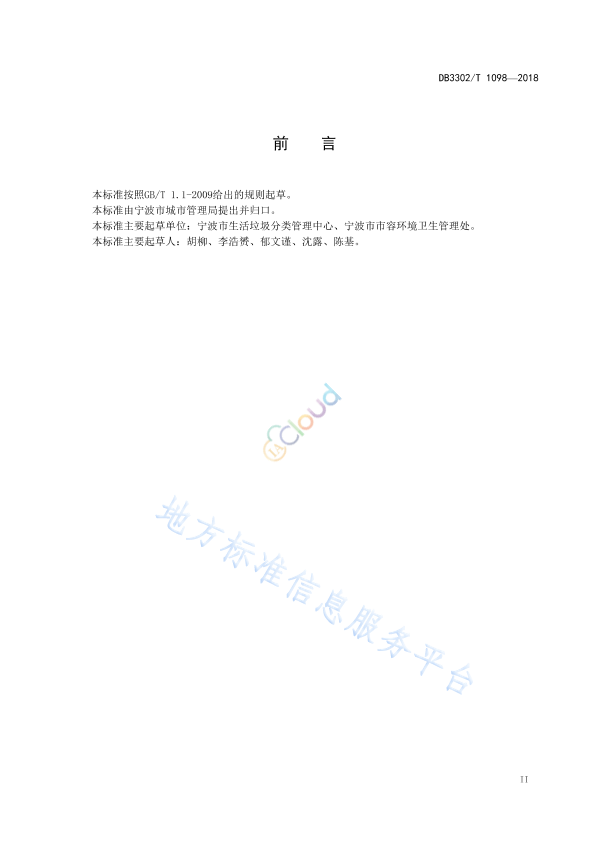 本标准按照GB/T 1.1-2009给出的规则起草。 本标准由宁波市城市管理局提出并归口。 本标准主要起草单位:宁波市生活垃圾分类管理中心、宁波市市容环境卫生管理处。 本标准主要起草人:胡柳、李浩赟、郁文谨、沈露、陈基。