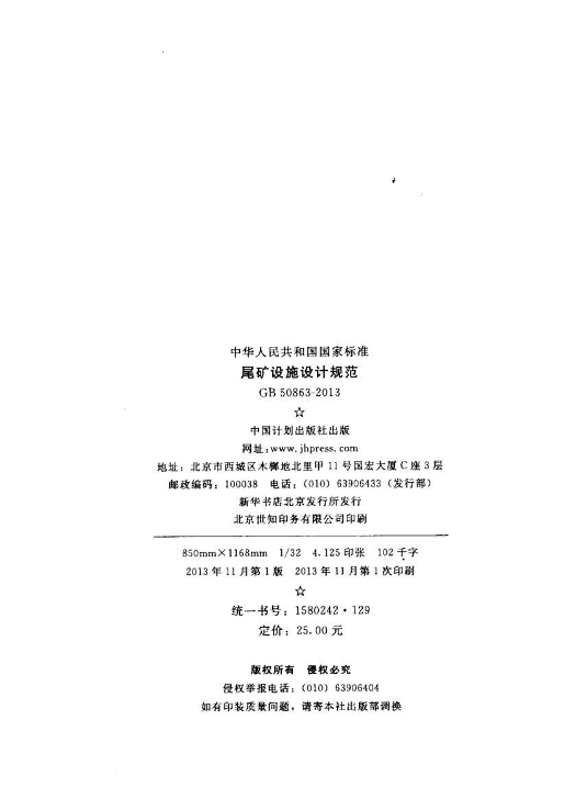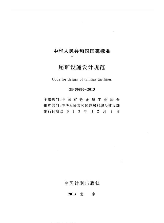 本规范是根据原建设部《关于印发的通知》建标函(2005 ) 124 号的要求,由中国恩菲工程技术有限公司会同有关单位共同编制完成。在规范编制过程中,编制组进行了广泛深入的调查研究,认真总结了新中国成立60 年来、特别是改革开放30 年来我国矿山尾矿设施建设的经验,井在广泛征求意见的基础上,经过反复讨论、修改和完善,最后经审查定稿。 本规范共分13章和5个附录。主要技术内容是:总则、术语、尾矿库、尾矿坝、尾矿干式堆存、尾矿库排洪、尾矿库闭库、尾矿回采、尾矿库田水、尾矿浓缩、尾矿输送、尾矿泵站、尾矿设施的环保措施等。 本规范中以黑体字标志的条文为强制性条文, 必须严格执行。 本规范由住房城乡建设部负责管理和对强制性条文的解释,由中国有色金属工业工程建设标准规范管理处负责日常管理, 由中国恩菲工程技术有限公司负责具体技术内容的解释。 本规范在执行过程中如有意见和建议,请寄送中国恩菲工程技术有限公司(地址:北京复兴路口号,邮政编码:100038) ,以供今后修订时参考。 本规范主编单位、参编单位、主要起草人和主要审查人:主编单位:中国恩菲工程技术有限公司、中国有色金属工业工程建设标准规范管理处。参编单位:中冶北方工程技术有限公司、中冶建筑研究总院、长沙有色冶金设计研究院有限公司、中冶长天国际工程技术有限公司、中国瑞林工程技术有限公司、昆明有色冶金设计研究院股份公司、马鞍山长江地质工程公司、长春黄金设计院、中冶沈勘秦皇岛工程技术有限公司、金堆城铝业集团有限公司、紫金矿业集团股份有限公司、北京高能时代环境技术股份有限公司、广东东方管业有限公司。主要起草人: 田文旗、陈守仁、杨燕、赵锡铭、戈振、刘德忠、刘石桥、杨春福、徐洪达、沈楼燕、张礼学、张元瑞、王树、郭振世、岑建、赵东寅、刘勇、林津强。主要审蛮人: 王治平、王汉强、郭天勇、王立忠、滕志国、徐政、李明阳、宗子就、李绪忠、周成湘、张岳安。