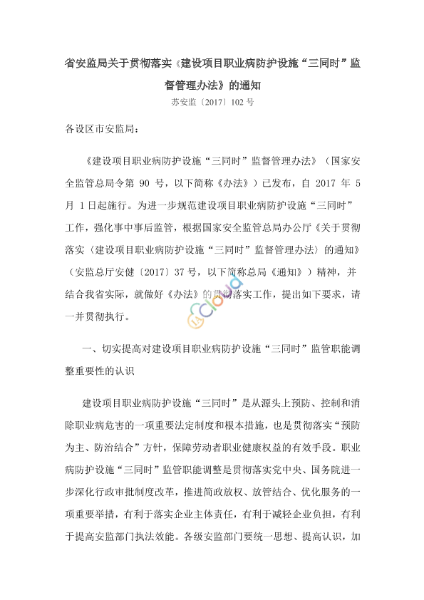 各省、自治区、直辖市及新疆生产建设兵团安全生产监督管理局,各中央企业: 《建设项目职业病防护设施“三同时”监督管理办法》(国家安全监管总局令第 90 号,以下简称《办法》)已公布,自 2017 年 5 月 1 日起施行。为做好《办法》的贯彻落实工作,现就有关事项通知如下: