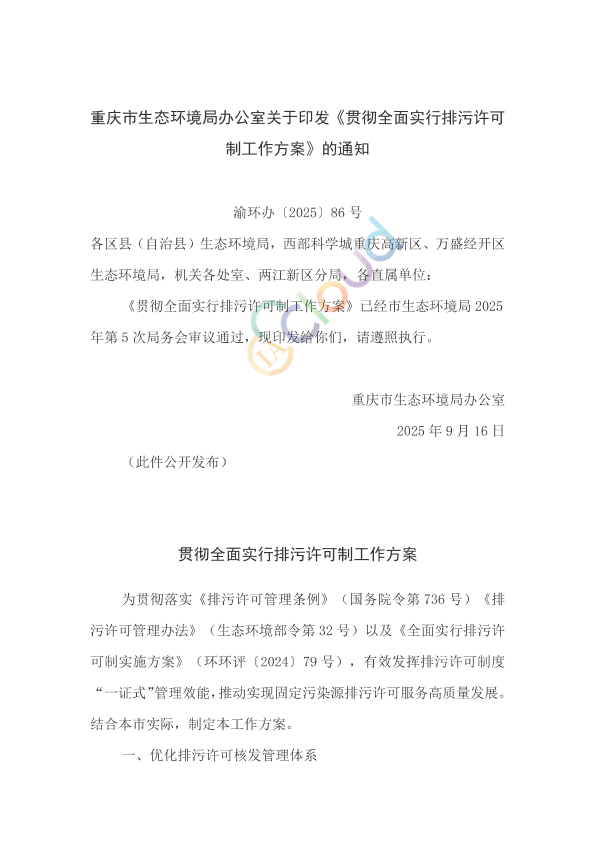 各区县(自治县)生态环境局,西部科学城重庆高新区、万盛经开区生态环境局,机关各处室、两江新区分局,各直属单位: 《贯彻全面实行排污许可制工作方案》已经市生态环境局2025年第5次局务会审议通过,现印发给你们,请遵照执行。 重庆市生态环境局办公室 2025年9月16日