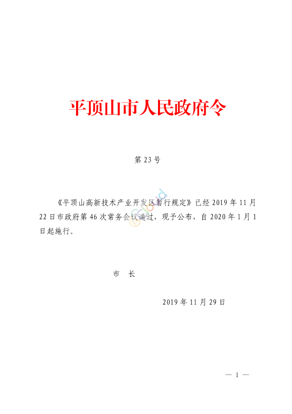 《平顶山高新技术产业开发区暂行规定》已经2019 年11 月22 日市政府第46 次常务会议通过,现予公布,自2020 年1 月1日起施行。 市长 2019 年11 月29 日