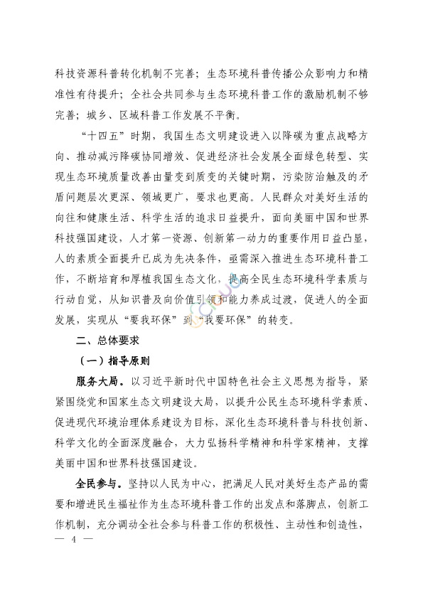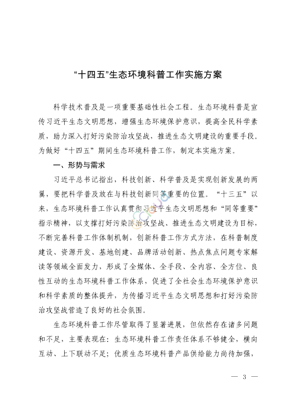 各省、自治区、直辖市生态环境厅(局),新疆生产建设兵团生态环境局,机关各部门,各派出机构、直属单位,各国家生态环境科普基地,各国家环境保护重点实验室、工程技术中心、科学观测研究站: 为全面贯彻党中央关于新时代加强科普工作的决策部署,深入落实国务院《全民科学素质行动规划纲要(2021-2035年)》有关要求,大力推进生态环境科普工作,助力深入打好污染防治攻坚战,我部制定了《“十四五”生态环境科普工作实施方案》。现印发给你们,请结合实际,认真组织实施。 生态环境部办公厅 2021年12月7日