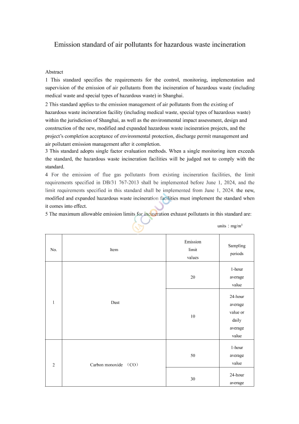 本文件规定了危险废物(含医疗废物)焚烧大气污染物排放控制要求、监测、达标判定和监督管理要求。 本文件适用于上海市辖区内现有危险废物(含医疗废物、)焚烧大气污染物排放管理,以及新建、改建、扩建危险废物焚烧项目的环境影响评价、环境保护设施设计与施工、竣工环境保护验收、排污许可管理及建成后的大气污染物排放管理。 已发布专项的国家污染控制标准或者环境保护标准的专用危险废物焚烧设施执行其专项标准。 危险废物熔融、热解、气化等高温热处理设施的污染物排放限值,若无专项国家或地方污染控制标准或者环境保护标准的,可参照本文件执行。 本标准不适用于利用锅炉和工业炉窑协同处置危险废物。