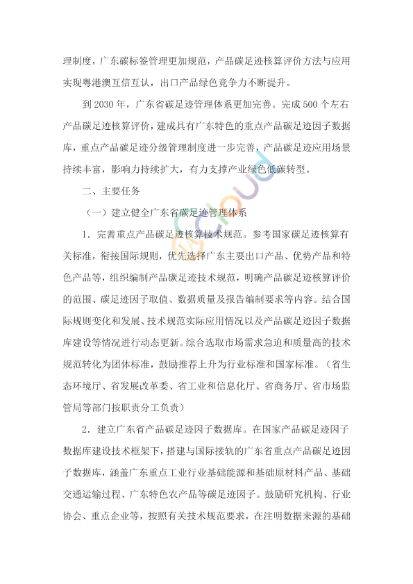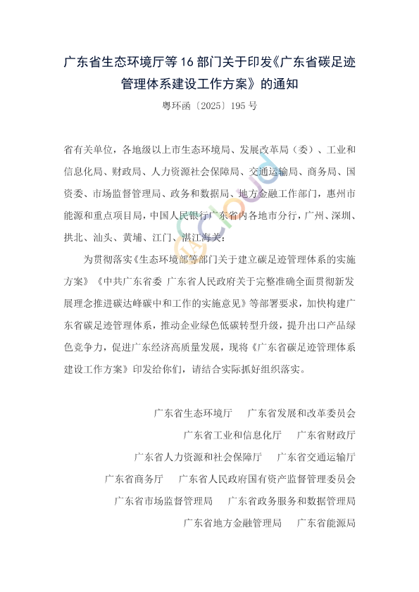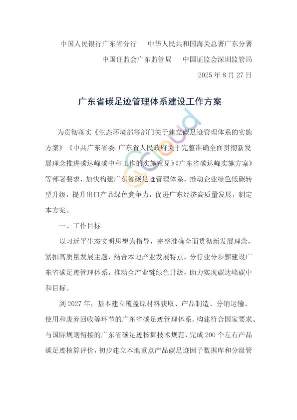 省有关单位,各地级以上市生态环境局、发展改革局(委)、工业和信息化局、财政局、人力资源社会保障局、交通运输局、商务局、国资委、市场监督管理局、政务和数据局、地方金融工作部门,惠州市能源和重点项目局,中国人民银行广东省内各地市分行,广州、深圳、拱北、汕头、黄埔、江门、湛江海关: 为贯彻落实《生态环境部等部门关于建立碳足迹管理体系的实施方案》《中共广东省委 广东省人民政府关于完整准确全面贯彻新发展理念推进碳达峰碳中和工作的实施意见》等部署要求,加快构建广东省碳足迹管理体系,推动企业绿色低碳转型升级,提升出口产品绿色竞争力,促进广东经济高质量发展,现将《广东省碳足迹管理体系建设工作方案》印发给你们,请结合实际抓好组织落实。 广东省生态环境厅 广东省发展和改革委员会 广东省工业和信息化厅 广东省财政厅 广东省人力资源和社会保障厅 广东省交通运输厅 广东省商务厅 广东省人民政府国有资产监督管理委员会 广东省市场监督管理局 广东省政务服务和数据管理局 广东省地方金融管理局 广东省能源局 中国人民银行广东省分行 中华人民共和国海关总署广东分署 中国证监会广东监管局 中国证监会深圳监管局 2025年8月27日
