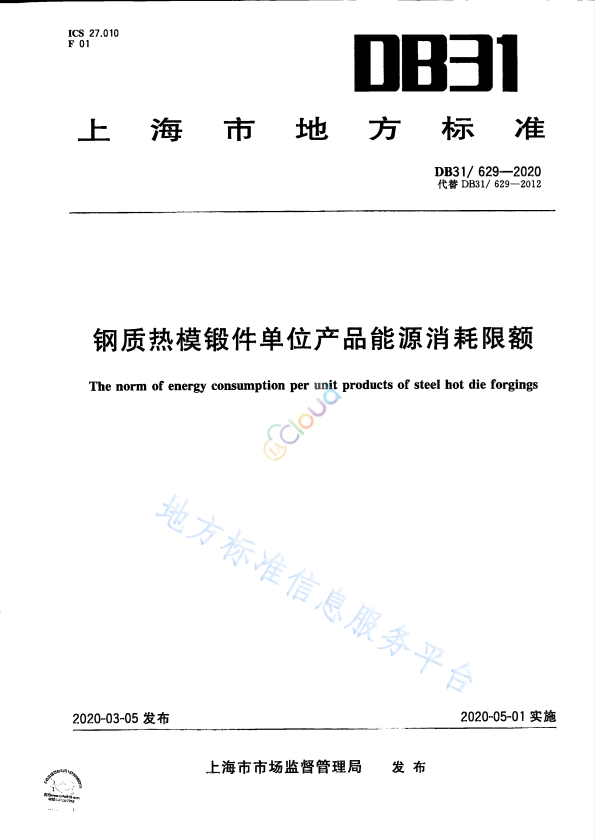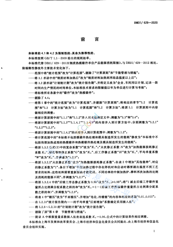 本标准的4.1和4.2为强制性的,其余为推荐性的。 本标准按照GB/T 1.1- -2009给出的规则起草。 本标准代替DB31/ 629- 2012《 钢质热模锻件单位产品能源消耗限额》,与DB31/ 629- 2012 相比,除编辑性修改外主要技术变化如下: -范围中将“统计范围”改为“计算范围”,删除了“计算原则”和“节能管理与措施"; -将3.1术语中的“钢质材料加热后”改为“钢质材料加热到再结晶温度以上后”; -将3.2原术语“计划统计期”改为“统计报告期”,并将定义改为“企业、车间用以计划、记录一段时间内生产情况的时间单位,本标准技术要求的限额值以年为单位进行计算与考核”; -将标准所有条款中的“锻件”改为“热模锻件”; -删除了4.4; -将第5章中的“统计范围”改为“计算范围”,并删除“计算原则”,将相应的章节“5.2计算范围”和“5.3计算方法”改为“5.1 计算范围”和“5.2 计算方法” ,将原5.1计算原则中内容做相应的调整; -将原计算原则中的“5.1.1”和“5.1.2”并人到术语和定义中,调整为“3.3”和“3.4"; -将原计算原则中的“5.1.3”“5.1.4.1”“5.1.4.3"的内容并人到计算方法中,分别调整为“5.2.1”“5.2.2"“5.2.3"; -将原计算原则中的“5.1.4.2”的内容并人到计算范围中,调整为“5.1.2”; -将计算范围中的“本标准不包括模锻件热处理和模具制造所发生的能耗”修改为“本标准中不包括局部加热成型的热模锻件和热模锻件热处理及模具制造所发生的能耗”; -将原5.3.2公式(2)中的复杂系数“S”改为“K1”;“火次修正系数N”改为“加热能源损耗修正系数K2"、精度等级修正系数“G”改为“K;"、后工序修正系数“H"改为“K,"、平均单重系数“W”改为“K。”,并调整为“5.2.5”; -将原5.3.2.2"火次修正系数”改为“加热能源攒耗修正系数”,在表2中增加“其他能种”、对应的修正系数为“1”,条目下增加“中频加热过程中存在停机时和启动时都要剔出温度不到工艺要求的坯料,这些坯料需要重新加热才能使用。不同功率的中频加热炉,棒料再次加热的比例及消耗的能源不同”,并调整为“5.2.7”; -将原5.3.2.4 中的“后续工序总修正系数为0.98”改为“K.≥0.98";将“1臧去后续工序锻件重量所占比例乘分配系数之积的和”改为“K,=1一(后续工序热模锻件重量所占比例乘分配系数之积的和)”,并调整为“5.2.9"; -将表4中“精压”改为“平面精压”,并增加“皂化冷精整”的内容和相应的系数“0.01、0.015”; -在5.2.10“统计报告期内....的平均单重”后面增加“系数确定采用插人法”; -将5.2.6~5.2.10的“计划统计期”改为“统计报告期”; -删除了原“第6章 节能管理与措施”; -附录A中根据重量系数插人法查表选系数Ks=0.96,公式中的计算结果作相应调整。 本标准由上海市发腰和改革委员会、上海市经济和信息化委员会共同提出,由上海市经济和信息化委员会组织实施。 本标准由上海市能源标准化技术委员会归口。 本标准起草单位:上海市锻造协会、上海市能效中心、上海交通大学、上海纳铁福传动轴有限公司、.上海交大中京锻压有限公司。 本标准主要起草人:陈德明、缪桃生吴兵、崔振山、周奕、孙礼宾、金跃进、陆文渊、秦宏波、薛恒荣。 本标准所代替标准的历次版本发布情况为: -DB31/ 629- 2012。