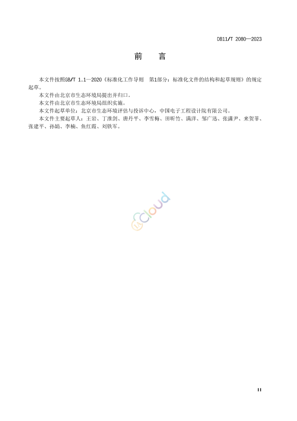 本文件按照GB/T 1. 1- 2020《标准化工作导则第1部分: 标准化文件的结构和起草规则》的规定起草。 本文件由北京市生态环境局提出并归口。 本文件由北京市生态环境局组织实施。 本文件起草单位:北京市生态环境评估与投诉中心,中国电子工程设计院有限公司。 本文件主要起草人:王岩、丁淮剑、唐丹平、李雪梅、田昕竹、满洋、邹广迅、张潇尹、来贺菲、张建平、孙娟、李楠、鱼红霞、刘铁军。