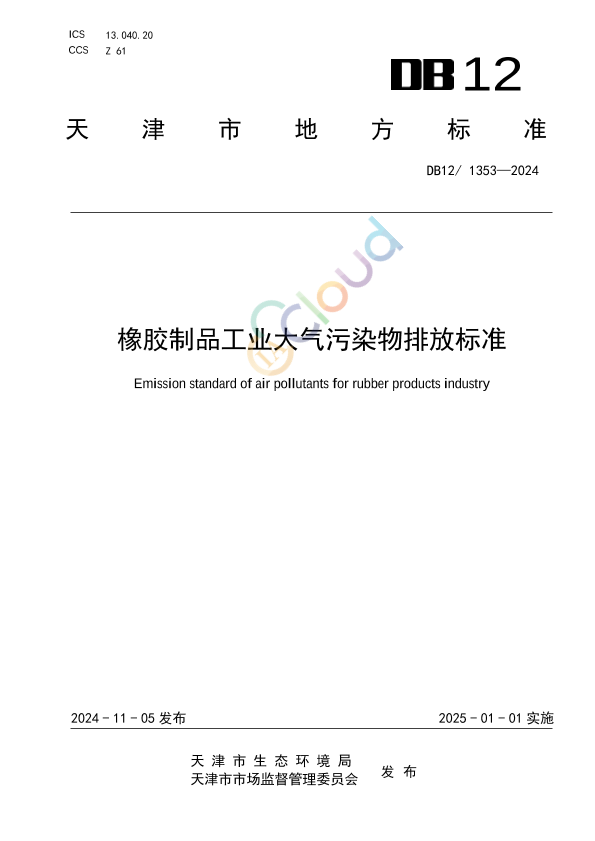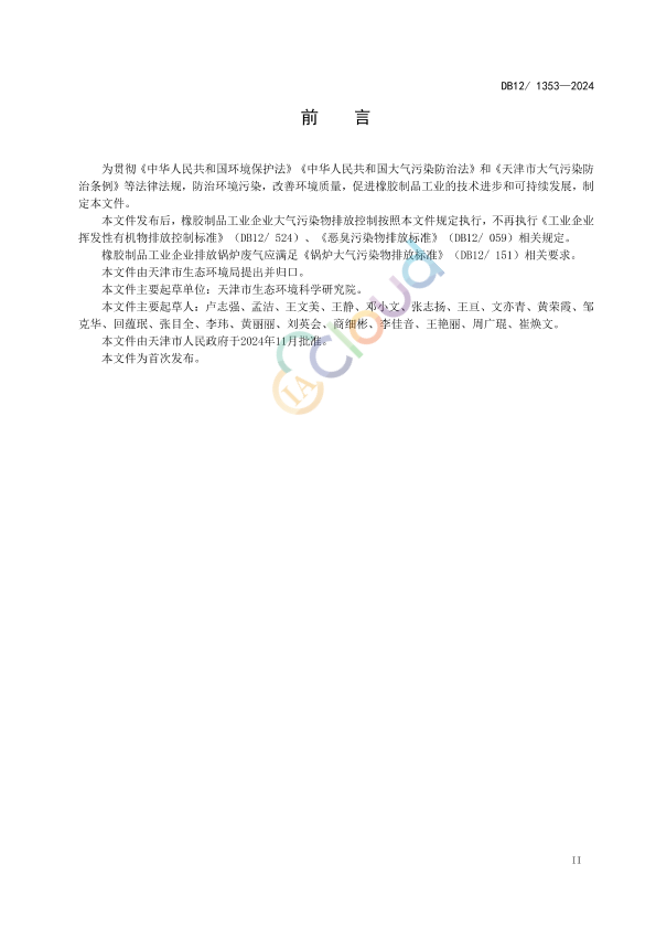 为贯彻《中华人民共和国环境保护法》《中华人民共和国大气污染防治法》和《天津市大气污染防治条例》等法律法规,防治环境污染,改善环境质量,促进橡胶制品工业的技术进步和可持续发展,制定本文件。 本文件发布后,橡胶制品工业企业大气污染物排放控制按照本文件规定执行,不再执行《工业企业挥发性有机物排放控制标准》(DB12/ 524)、《恶臭污染物排放标准》(DB12/ 059)相关规定。 橡胶制品工业企业排放锅炉废气应满足《锅炉大气污染物排放标准》(DB12/ 151)相关要求。 本文件由天津市生态环境局提出并归口。 本文件主要起草单位:天津市生态环境科学研究院。 本文件主要起草人:卢志强、孟洁、王文美、王静、邓小文、张志扬、王亘、文亦青、黄荣霞、邹克华、回蕴珉、张目全、李玮、黄丽丽、刘英会、商细彬、李佳音、王艳丽、周广琨、崔焕文。 本文件由天津市人民政府于2024年11月批准。 本文件为首次发布。