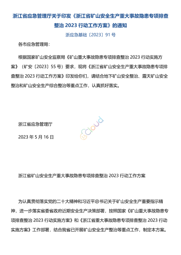 各市应急管理局: 根据国家矿山安全监察局《矿山重大事故隐患专项排查整治2023行动实施方案》(矿安〔2023〕55号)要求,现将《浙江省矿山安全生产重大事故隐患专项排查整治2023行动工作方案》印发给你们,请结合地下矿山安全整治、露天矿山安全整治和矿山安全生产综合整治等重点工作,认真抓好落实。 浙江省应急管理厅 2023年5月16日