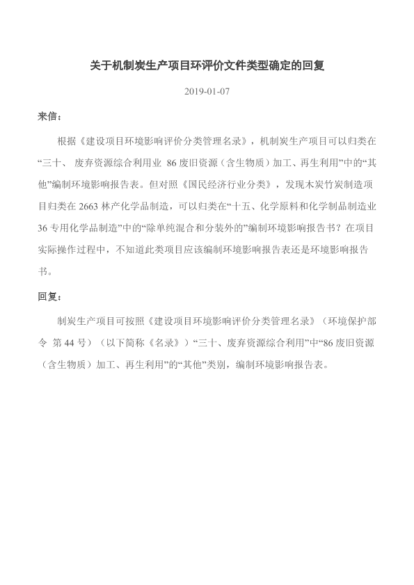 来信: 根据《建设项目环境影响评价分类管理名录》,机制炭生产项目可以归类在“三十、 废弃资源综合利用业 86废旧资源(含生物质)加工、再生利用”中的“其他”编制环境影响报告表。但对照《国民经济行业分类》,发现木炭竹炭制造项目归类在2663林产化学品制造,可以归类在“十五、化学原料和化学制品制造业 36专用化学品制造”中的“除单纯混合和分装外的”编制环境影响报告书?在项目实际操作过程中,不知道此类项目应该编制环境影响报告表还是环境影响报告书。