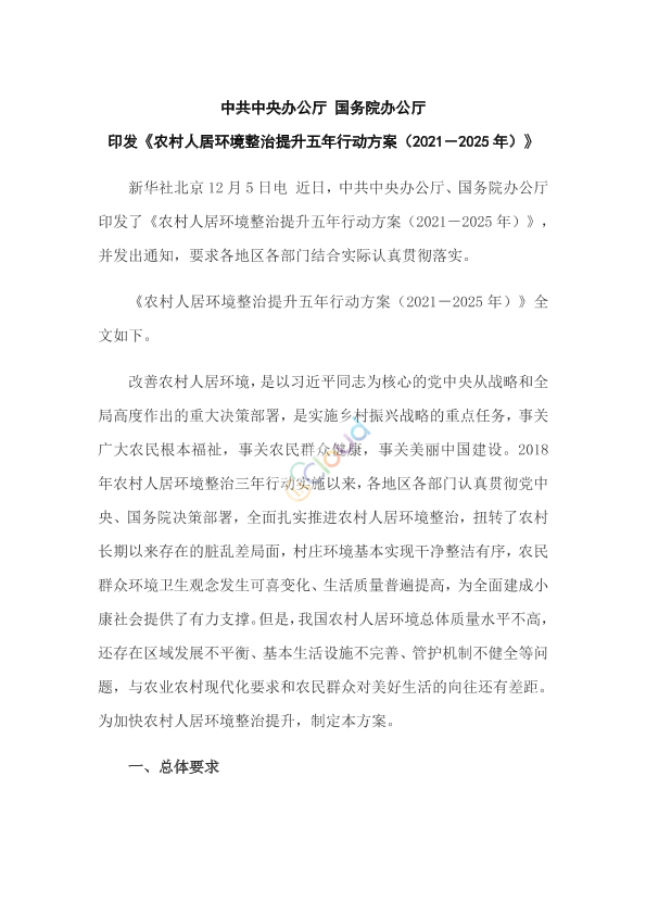 新华社北京12月5日电 近日,中共中央办公厅、国务院办公厅印发了《农村人居环境整治提升五年行动方案(2021-2025年)》,并发出通知,要求各地区各部门结合实际认真贯彻落实。 《农村人居环境整治提升五年行动方案(2021-2025年)》全文如下。