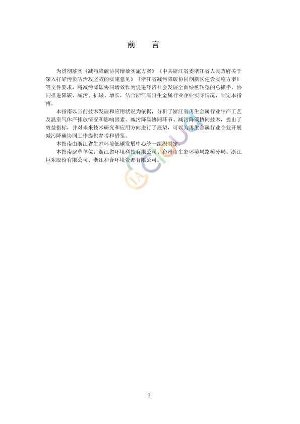 为贯彻落实《减污降碳协同增效实施方案》《中共浙江省委浙江省人民政府关于深入打好污染防治攻坚战的实施意见》《浙江省减污降碳协同创新区建设实施方案》等文件要求,将减污降碳协同增效作为促进经济社会发展全面绿色转型的总抓手,协同推进降碳、减污、扩绿、增长,结合浙江省再生金属行业企业实际情况,制定本指南。 本指南以当前技术发展和应用状况为依据,分析了浙江省再生金属行业生产工艺及温室气体产排放情况和影响因素、减污降碳协同环节、减污降碳协同技术,提出了效益指标,并对未来技术研究和应用方向进行了展望,可以为再生金属行业企业开展减污降碳协同工作提供参考和借鉴。 本指南由浙江省生态环境低碳发展中心统一组织制定。 本指南起草单位:浙江省环境科技有限公司、台州市生态环境局路桥分局、浙江巨东股份有限公司、浙江和合环境资源有限公司。