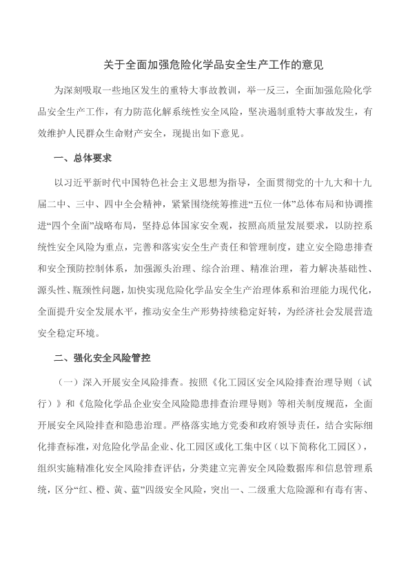 新华社北京2月26日电 近日,中共中央办公厅、国务院办公厅印发了《关于全面加强危险化学品安全生产工作的意见》,并发出通知,要求各地区各部门结合实际认真贯彻落实。 《关于全面加强危险化学品安全生产工作的意见》全文如下。