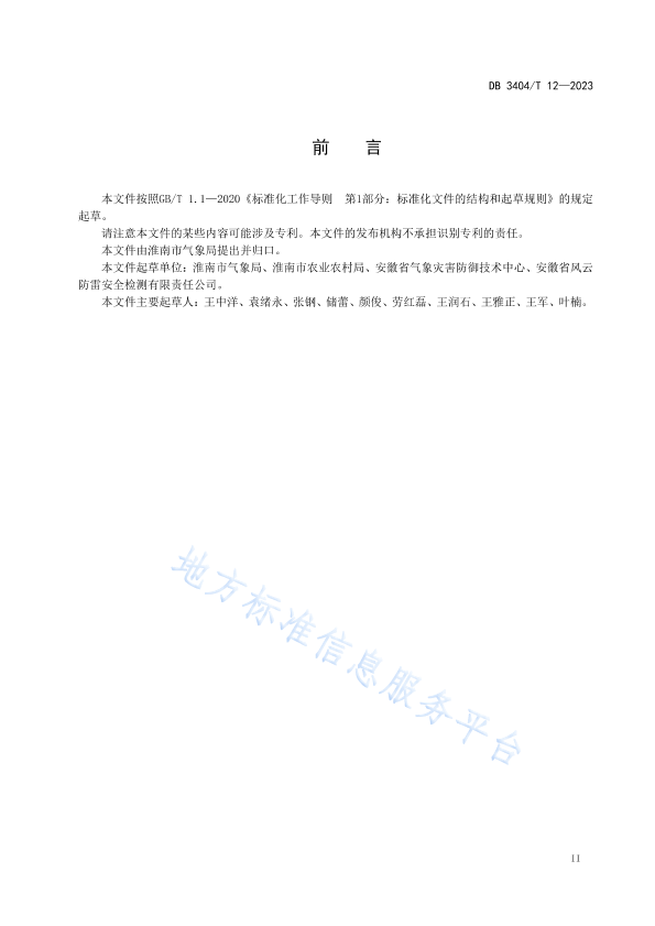 本文件按照GB/T 1.1—2020《标准化工作导则第1部分:标准化文件的结构和起草规则》的规定起草。 请注意本文件的某些内容可能涉及专利。本文件的发布机构不承担识别专利的责任。 本文件由淮南市气象局提出并归口。