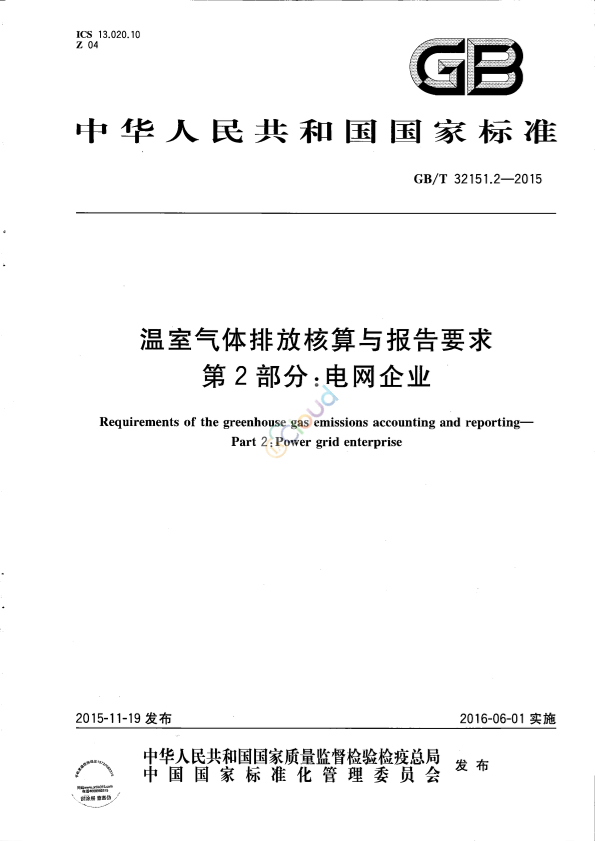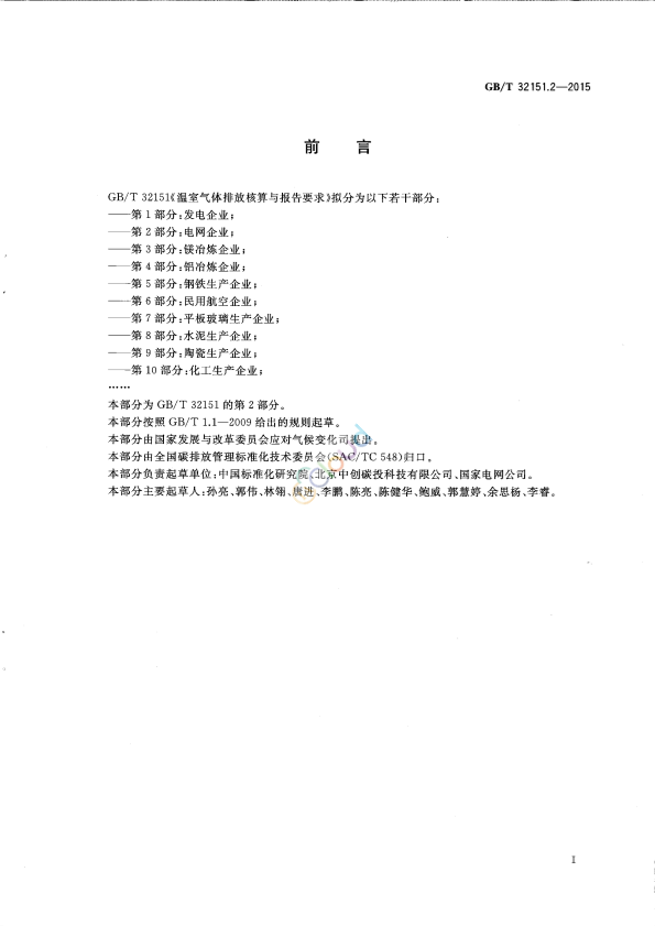 GB/T32151《温室气体排放核算与报告要求》拟分为以下若干部分∶ ——第1部分∶发电企业; ——第2部分∶电网企业; ——第3部分∶镁冶炼企业; ——第 4部分∶铝冶炼企业; ——第5部分∶钢铁生产企业; ——第6部分∶民用航空企业; ——第7部分∶平板玻璃生产企业; ——第8部分∶水泥生产企业; ——第9部分∶陶瓷生产企业; ——第10部分∶化工生产企业;. 本部分为GB/T 32151 的第2 部分。 本部分按照GB/T 1.1—2009给出的规则起草。 本部分由国家发展与改革委员会应对气候变化司提出。 本部分由全国碳排放管理标准化技术委员会(SAC/TC548)归口。 本部分负责起草单位∶中国标准化研究院、北京中创碳投科技有限公司、国家电网公司。 本部分主要起草人∶孙亮、郭伟、林翎、唐进、李鹏、陈亮、陈健华、鲍威、郭慧婷、余思杨、李睿。