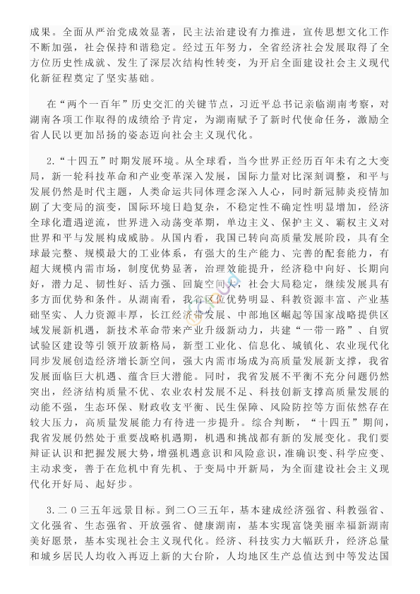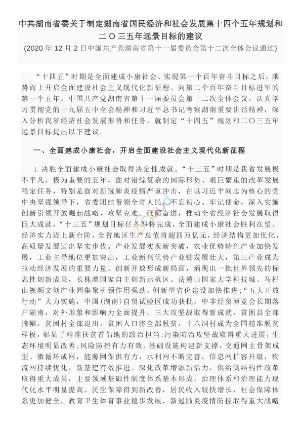(2020年12月2日中国共产党湖南省第十一届委员会第十二次全体会议通过) “十四五”时期是全面建成小康社会、实现第一个百年奋斗目标之后,乘势而上开启全面建设社会主义现代化新征程、向第二个百年奋斗目标进军的第一个五年。中国共产党湖南省第十一届委员会第十二次全体会议,认真学习贯彻党的十九届五中全会精神和习近平总书记考察湖南重要讲话精神,深入分析我省经济社会发展形势和任务,就制定“十四五”规划和二〇三五年远景目标提出以下建议。