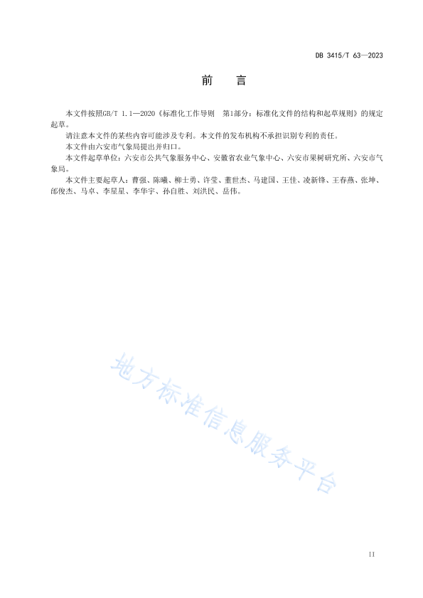本文件按照GB/T 1.1—2020《标准化工作导则 第1部分:标准化文件的结构和起草规则》的规定起草。 请注意本文件的某些内容可能涉及专利。本文件的发布机构不承担识别专利的责任。 本文件由六安市气象局提出并归口。 本文件起草单位:六安市公共气象服务中心、安徽省农业气象中心、六安市果树研究所、六安市气象局。