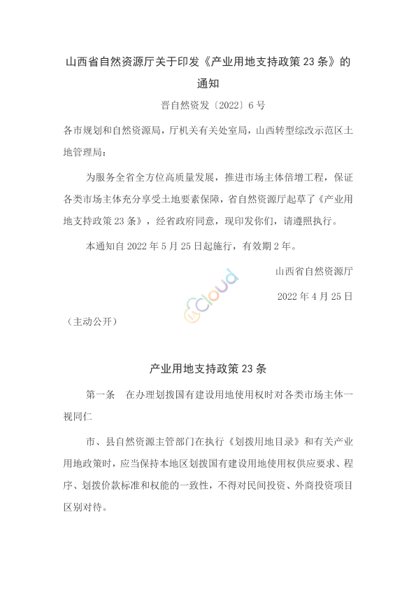 各市规划和自然资源局,厅机关有关处室局,山西转型综改示范区土地管理局: 为服务全省全方位高质量发展,推进市场主体倍增工程,保证各类市场主体充分享受土地要素保障,省自然资源厅起草了《产业用地支持政策23条》,经省政府同意,现印发你们,请遵照执行。 本通知自2022年5月25日起施行,有效期2年。 山西省自然资源厅 2022年4月25日
