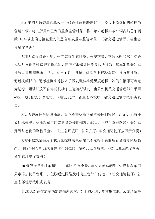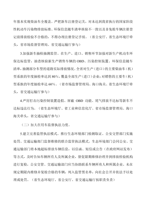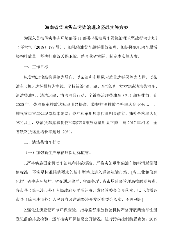 各市、县、自治县人民政府,各相关单位: 为深入贯彻落实国务院《打赢蓝天保卫战三年行动计划》(国发〔2018〕22号)、生态环境部等11部委《柴油货车污染治理攻坚战行动计划》(环大气〔2018〕179号)和省委省政府《海南省全面加强生态环境保护坚决打好污染防治攻坚战行动方案》(琼发〔2019〕6号),加强柴油货车超标排放治理,加快降低机动车船污染物排放量,坚决打赢蓝天保卫战,我办制定了《海南省柴油货车污染治理攻坚战实施方案》。经省政府同意,现印发给你们,请遵照执行。 海南省大气污染防治工作领导小组办公室 2019年7月29日