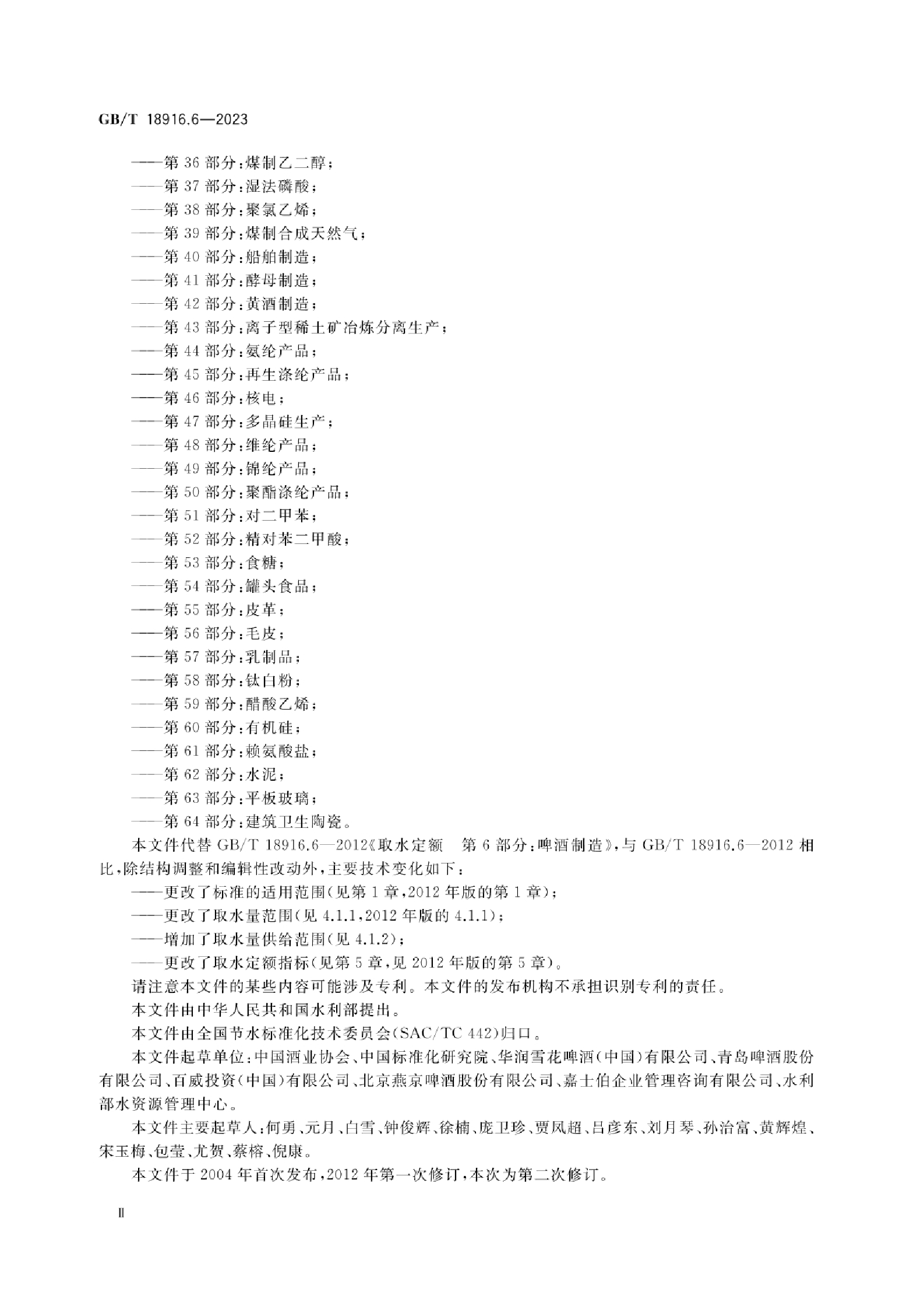 本文件按照GB/T 1.1—2020《标准化工作导则第1部分:标准化文件的结构和起草规则》的规定起草。 请注意本文件的某些内容可能涉及专利。本文件的发布机构不承担识别专利的责任。 本文件由中华人民共和国水利部提出。 本文件由全国节水标准化技术委员会(SAC/TC 442)归口。 本文件起草单位:中国酒业协会 、中国标准化研究院 、华润雪花啤酒(中国)有限公司 、青岛啤酒股份有限公司 、百威投资(中国)有限公司 、北京燕京啤酒股份有限公司 、嘉士伯企业管理咨询有限公司 、水利部水资源管理中心 。 本文件主要起草人:何勇 、元月 、白雪 、钟俊辉 、徐楠 、庞卫珍 、贾凤超 、吕彦东 、刘月琴 、孙治富 、黄辉煌 、宋玉梅 、包莹 、尤贺 、蔡榕 、倪康 。