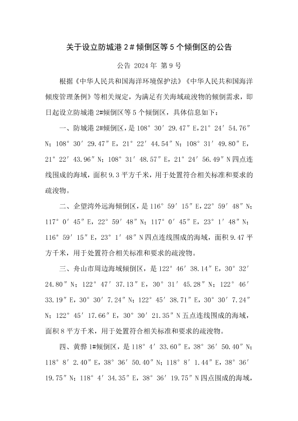 根据《中华人民共和国海洋环境保护法》《中华人民共和国海洋倾废管理条例》等相关规定,为满足有关海域疏浚物的倾倒需求,即日起设立防城港2#倾倒区等5个倾倒区,具体信息如下:
