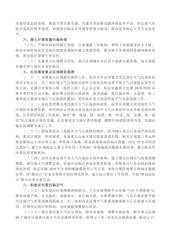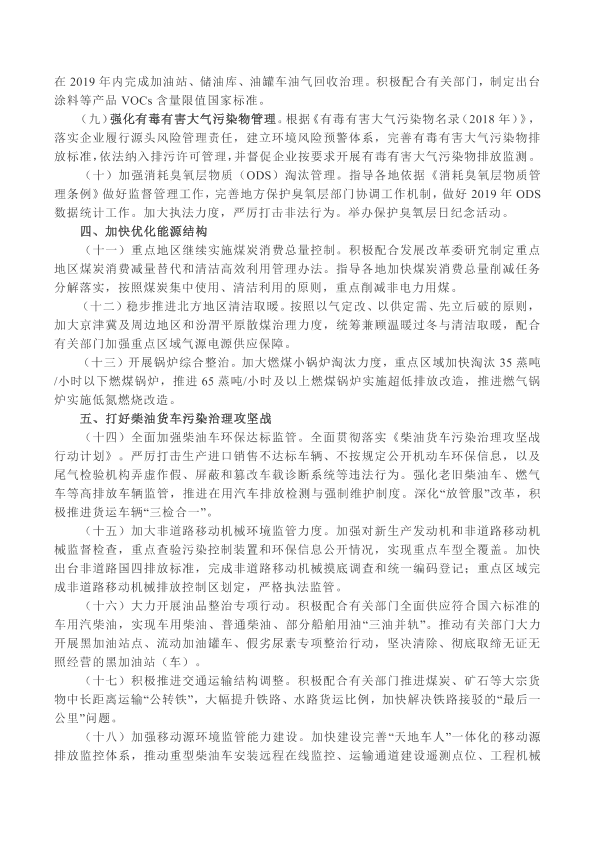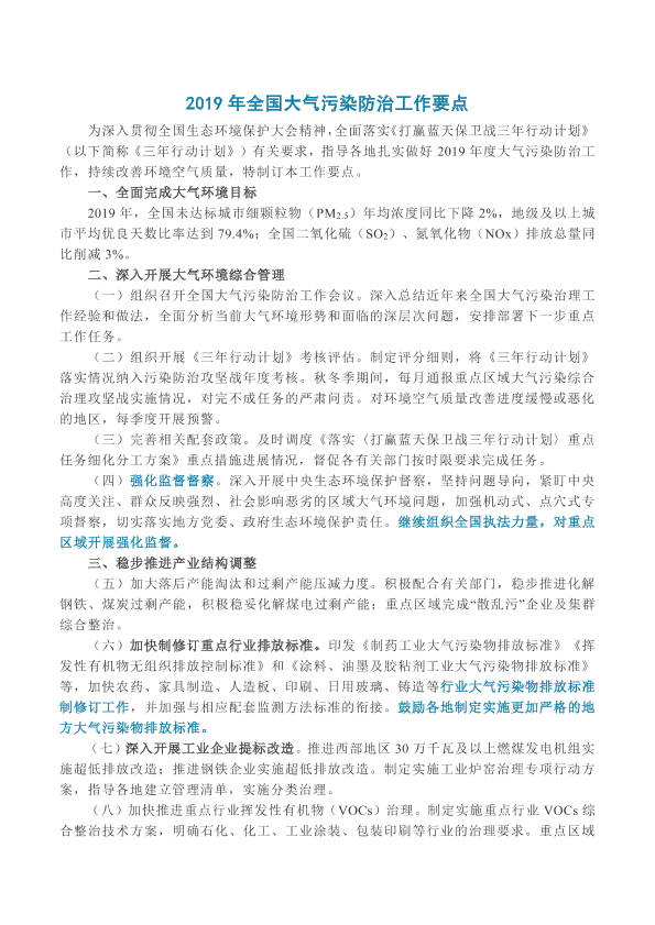 各省、自治区、直辖市生态环境厅(局),新疆生产建设兵团环境保护局: 为深入贯彻全国生态环境保护大会精神,全面落实《打赢蓝天保卫战三年行动计划》有关要求,我部编制了《2019年全国大气污染防治工作要点》。现印发给你们,请参照执行。 生态环境部办公厅 2019年2月27日
