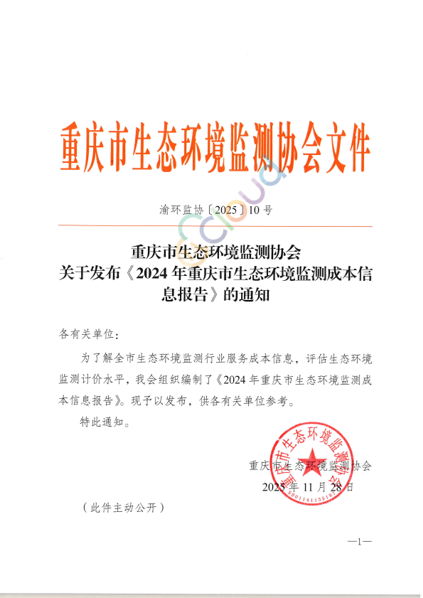 各有关单位: 为了解全市生态环境监测行业服务成本信息,评估生态环境监测计价水平,我会组织编制了《2024年重庆市生态环境监测成本信息报告》。现予以发布,供各有关单位参考。 特此通知。 重庆市生态环境监测协会 2025年11月28日
