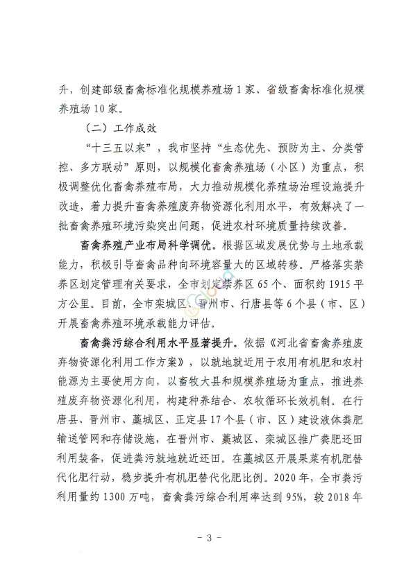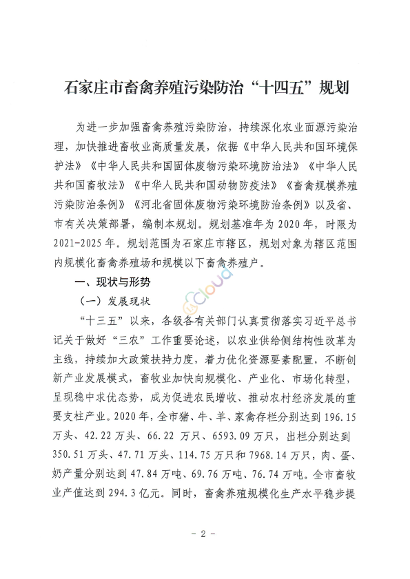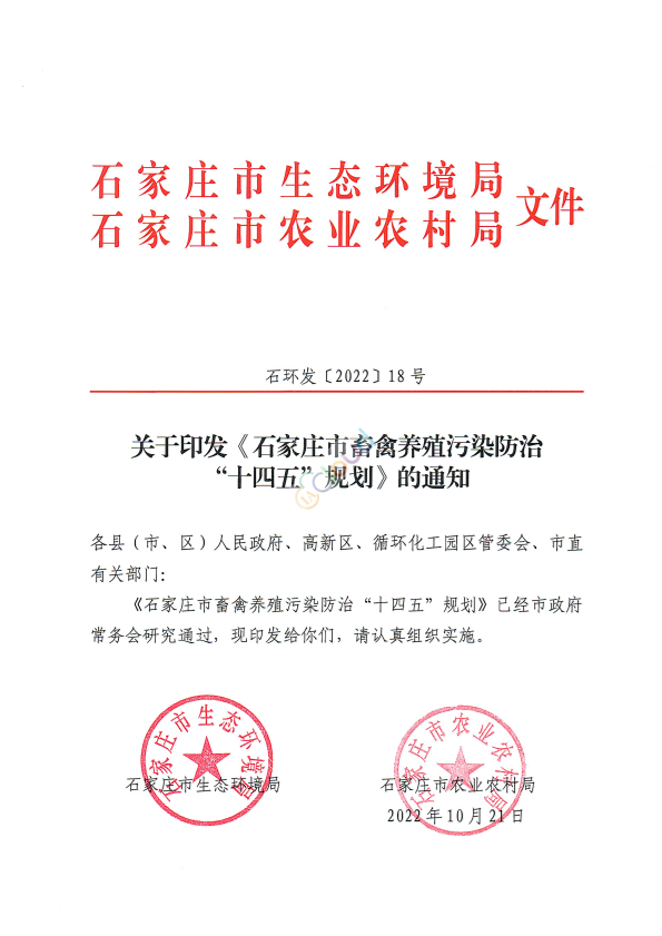 各县(市、区)人民政府、高新区、循环化工园区管委会、市直有关部门: 《石家庄市畜禽养殖污染防治“十四五”规划》已经市政府常务会研究通过,现印发给你们,请认真组织实施。