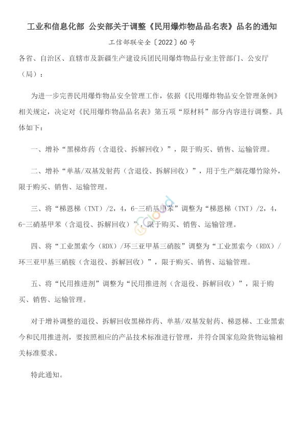 各省、自治区、直辖市及新疆生产建设兵团民用爆炸物品行业主管部门、公安厅(局): 为进一步完善民用爆炸物品安全管理工作,依据《民用爆炸物品安全管理条例》相关规定,决定对《民用爆炸物品品名表》第五项“原材料”部分内容进行调整。具体如下: