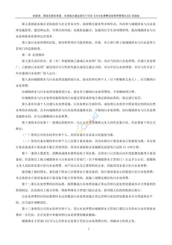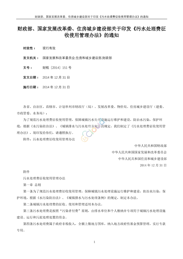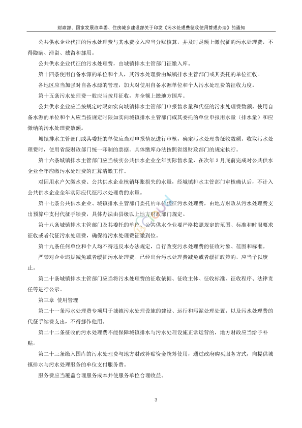 各省、自治区、直辖市、计划单列市财政厅(局)、发展改革委、物价局、住房城乡建设厅(建委、市政管委、水务局): 为了规范污水处理费征收使用管理,保障城镇污水处理设施运行维护和建设,防治水污染,保护环境,根据《水污染防治法》、《城镇排水与污水处理条例》的规定,我们制定了《污水处理费征收使用管理办法》,现印发给你们,请遵照执行。 附件:污水处理费征收使用管理办法 中华人民共和国财政部 中华人民共和国国家发展和改革委员会 中华人民共和国住房和城乡建设部 2014年12月31日