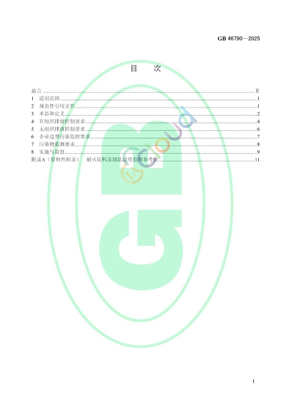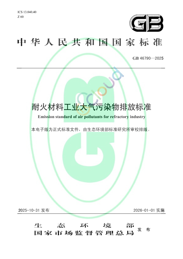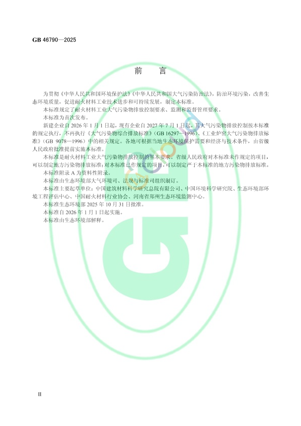 为贯彻《中华人民共和国环境保护法》《中华人民共和国大气污染防治法》,防治环境污染,改善生态环境质量,促进耐火材料工业技术进步和可持续发展,制定本标准。 本标准规定了耐火材料工业大气污染物排放控制要求、监测和监督管理要求。 本标准为首次发布。 新建企业自 2026 年 1 月 1 日起,现有企业自 2027 年 7 月 1 日起,其大气污染物排放控制按本标准的规定执行,不再执行《大气污染物综合排放标准》(GB 16297—1996)、《工业炉窑大气污染物排放标准》(GB 9078—1996)中的相关规定。各地可根据当地生态环境保护需要和经济与技术条件,由省级人民政府批准提前实施本标准。 本标准是耐火材料工业大气污染物排放控制的基本要求。省级人民政府对本标准未作规定的项目,可以制定地方污染物排放标准;对本标准已作规定的项目,可以制定严于本标准的地方污染物排放标准。 本标准附录 A 为资料性附录。 本标准由生态环境部大气环境司、法规与标准司组织制订。 本标准主要起草单位:中国建筑材料科学研究总院有限公司、中国环境科学研究院、生态环境部环境工程评估中心、中国耐火材料行业协会、河南省郑州生态环境监测中心。 本标准生态环境部 2025 年 10 月 31 日批准。 本标准自 2026 年 1 月 1 日起实施。 本标准由生态环境部解释。